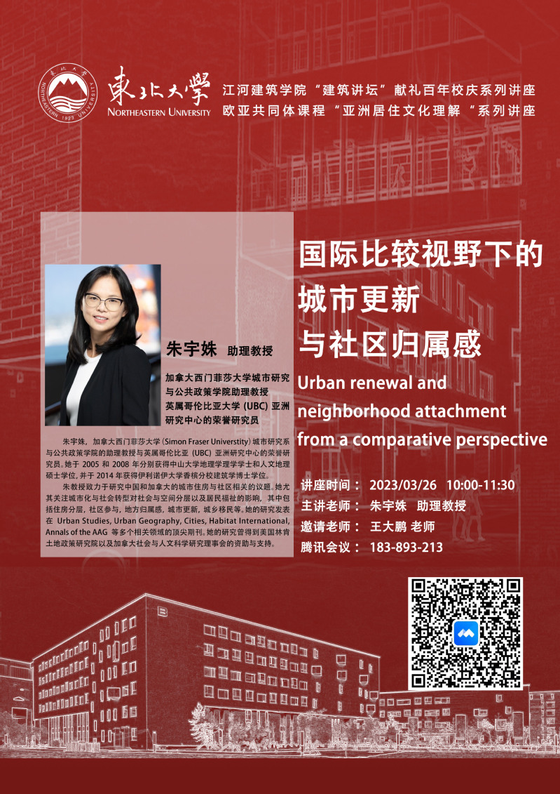 3月26日,应城乡规划系王大鹏老师邀请,加拿大西门菲莎大学(Simon Fraser University)城市研究与公共政策学院助理教授朱宇姝做客米兰网_米兰(中国)“建筑讲坛”(暨献礼百年校庆系列讲座),为我们做《国际比较视野下的城市更新与社区归属感》学术讲座,学院师生及国内同行80余人参加线上交流。