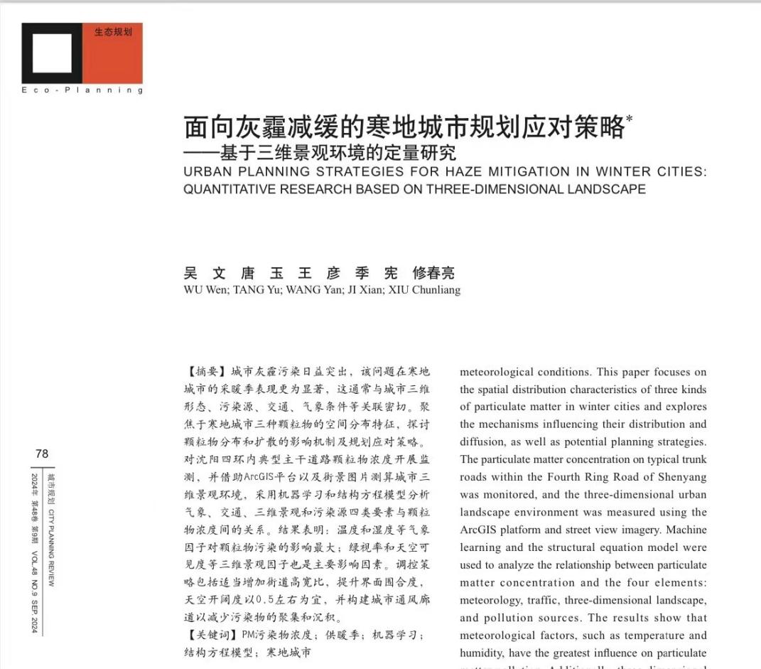 近日,我院城乡规划系吴文副教授团队在CSSCI期刊《城市规划》上发表题为“面向灰霾减缓的寒地城市规划应对策略——基于三维景观环境的定量研究”的论文。该研究成果以米兰网_米兰(中国)为第一完成单位,吴文副教授为第一作者,修春亮教授为通讯作者,该成果的合作作者还有硕士研究生唐玉、博士研究生王彦以及讲师季宪。