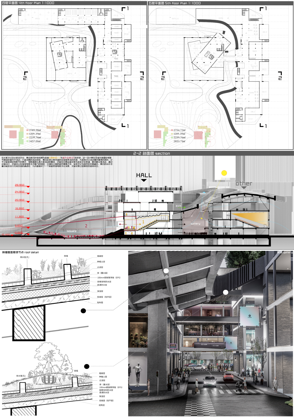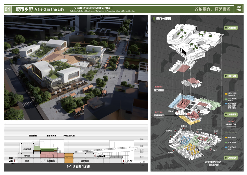 设计聚焦沈阳市迎春早市,从文旅融合视角展开农贸市场转型升级的城市设计与建筑单体设计。项目位于沈阳核心发展板块,周边居住区与商场众多,客源丰富但竞争大,同时拥有迎春湖和公园的生态资源。城市规划设计部分,针对场地面临的诸多困境与问题,项目计划以文旅融合视角,规划整合早夜市、农贸市场等东北文化特色市集,打造一个集生态休闲、文化体验与市井烟火于一体的城市活力片区,满足周边居民日常生活需求的同时,吸引游客沉浸式感受东北民俗风情。基于定位,五态重塑为理念,从生态、业态、形态、社态和文态五个方面推进。建筑单体设计选取农贸市集,针对传统农贸市场服务人群、空间、功能、生态等方面的问题,提出城市乡野设计概念,通过聚焦如何将农贸市场的“日常场景文旅化”的问题,计划将其打造为“能种田、能加工、能买菜的立体农贸市集”。设计将居民日常买菜、游客文化体验、社区邻里交往、共享屋顶农场等功能分层叠加,实现从单一交易空间到城市活力节点的转型,同时为高密度城市提供一片可参与、可呼吸的绿色空间。空间上,水平垂直双向增加开放性,呼应城市空间;功能上,一层保留交易功能,满足居民日常购物需求,二三层分别针对游客和居民设置文化体验和社区活动功能,同时为满足老中幼等不同年龄段人群的需求,设置了不同的特色体验空间;生态上,通过屋顶种植、雨水收集与利用等生态设计,提升了建筑的可持续性。