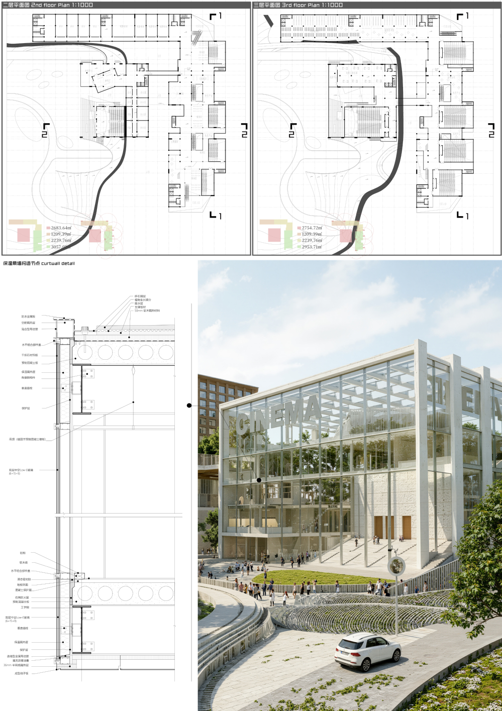 项目基地位于吉林省长春市电影城旧址,依托城市工业文化基因与电影艺术底蕴,旨在打造一座融合汽车工业主题、文化体验与公共生活的新型复合空间。设计以“工业记忆再生”为核心理念,通过覆土建筑形态与架空环廊的立体化空间叙事,回应长春汽车工业发展历程,屋顶覆土坡道与景观自然衔接,形成生态史与电影文化特色:建筑主体采用覆土形势呼应园区步道系统,下方形成公共广场,顶部覆土界面兼具节能效益;首层抬升的环形架空廊道与车道无缝对接园区交通,实现人车分流。功能布局上,沿街以退台层叠的商业体块延续城市生活服务,植入文创、餐饮等业态激活片区活力;内部纵向分区涵盖汽车服务工艺展示、创客空间等功能,并通过天窗体系与风廊组织优化光环境与通风效率。建筑以锈蚀钢板、玻璃幕墙与钢结构演绎工业美学,保留齿轮雕塑等遗迹形成“记忆长廊”,最终构建一处缝合城市肌理、对话历史与未来的文化地标。